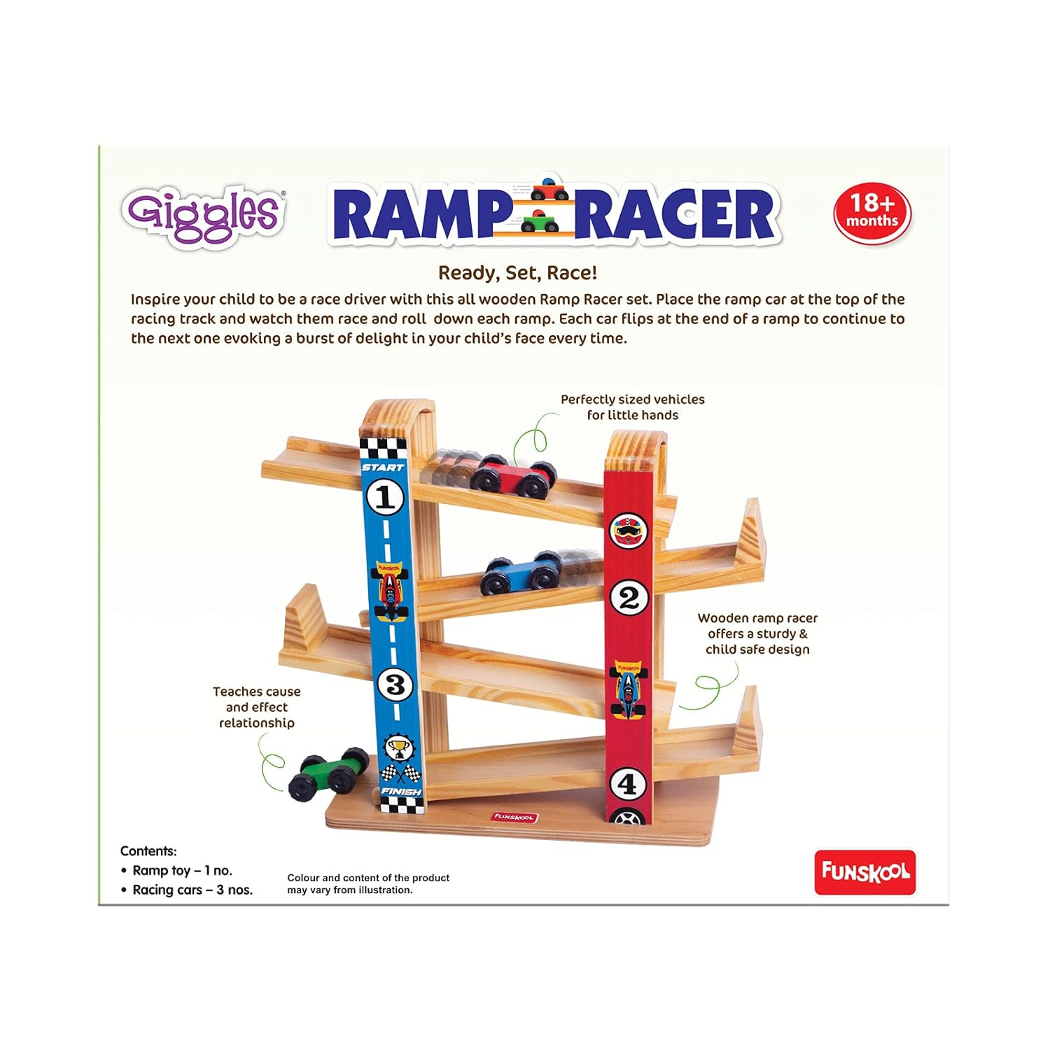Funskool Giggles - Ramp Racer, Wooden Racing Toy with 3 Mini Cars, Fine Motor Skills, Free Wheeling Cars, 18 Months & Above, Preschool Toys