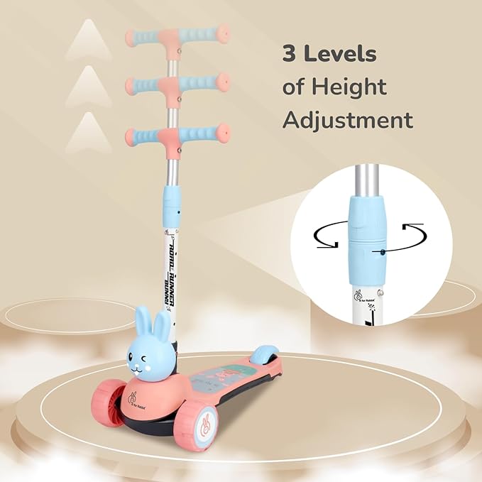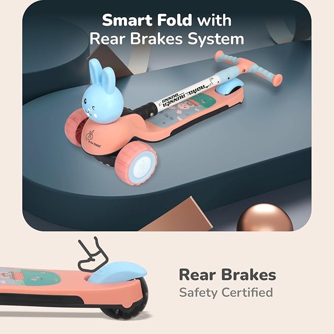 R for Rabbit Road Runner Bunny Kids Scooter, 3 Level Adjustable Height, Smart Fold & PU LED Wheels Kick Scooter with Brake for 3+ Years Kids, Weight Capacity Upto 75kgs (Pink Blue)