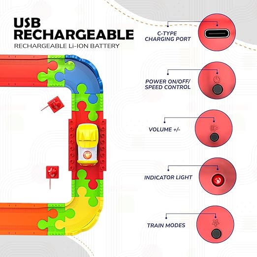 - bp 3- USB Rechargeable Type-C for Convenience: No more worrying about batteries! The train is USB RECHARGEABLE using a Type-C cable, ensuring quick charging and long-lasting playtime without interruptions.
