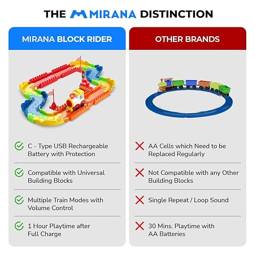- bp 2- Compatible with Universal Blocks: The Mirana Block Rider Train Set is compatible with all major block brands, allowing children to expand their tracks and build custom layouts using their favorite blocks;Light and Engine Sounds for Enhanced Play: This train set comes to life with lights and engine sounds that create a realistic atmosphere, making every ride more exciting and engaging for kids.
